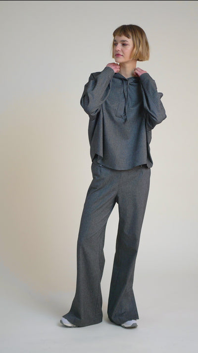 Loose hooded blouse with a half-button front, held by concealed snap fasteners made of soft flannel.
