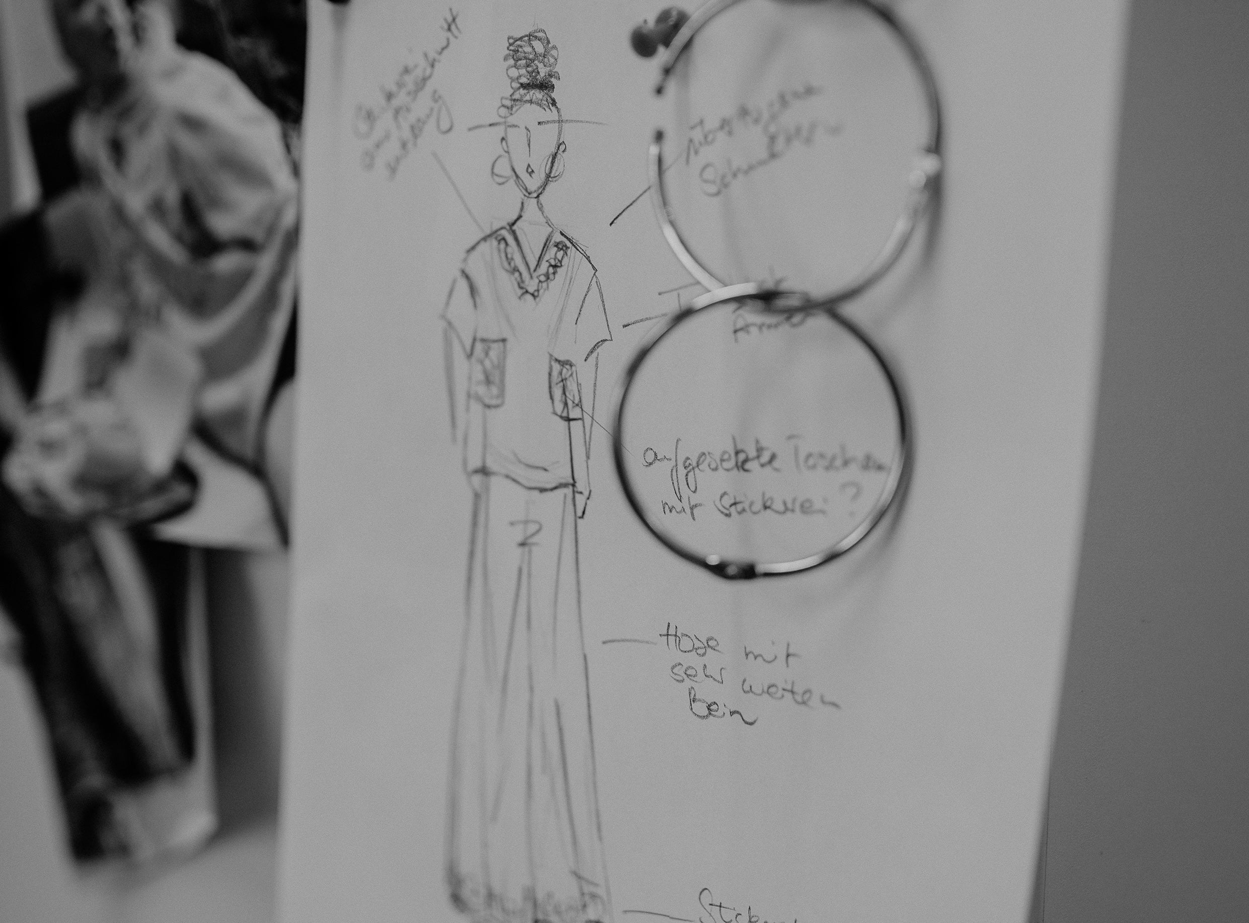 Unsere Modelle werden zunächst händisch gezeichnet und im Detail besprochen bevor sie als eine saubere, technische Zeichnung am PC umgesetzt werden. Diese Zeichnung dient, zusammen mit dem ausgewählten Stoff, unseren Schnitt- macherinnen als Grundlage, um entsprechende Schnitte zu erstellen. Es folgt der Zuschnitt, das Nähen und ein erster Prototyp unseres Modells ist entstanden. Daran können wir nun z.B. prüfen, ob Stoff und Schnitt harmonieren oder die Passform optimal rausgekommen ist. Je nach Ergebnis wird entweder ein weiterer Proto benötigt oder das Modell freigegeben. Mit der Freigabe können schließlich die Verkaufsmuster für die Messe gefertigt werden.