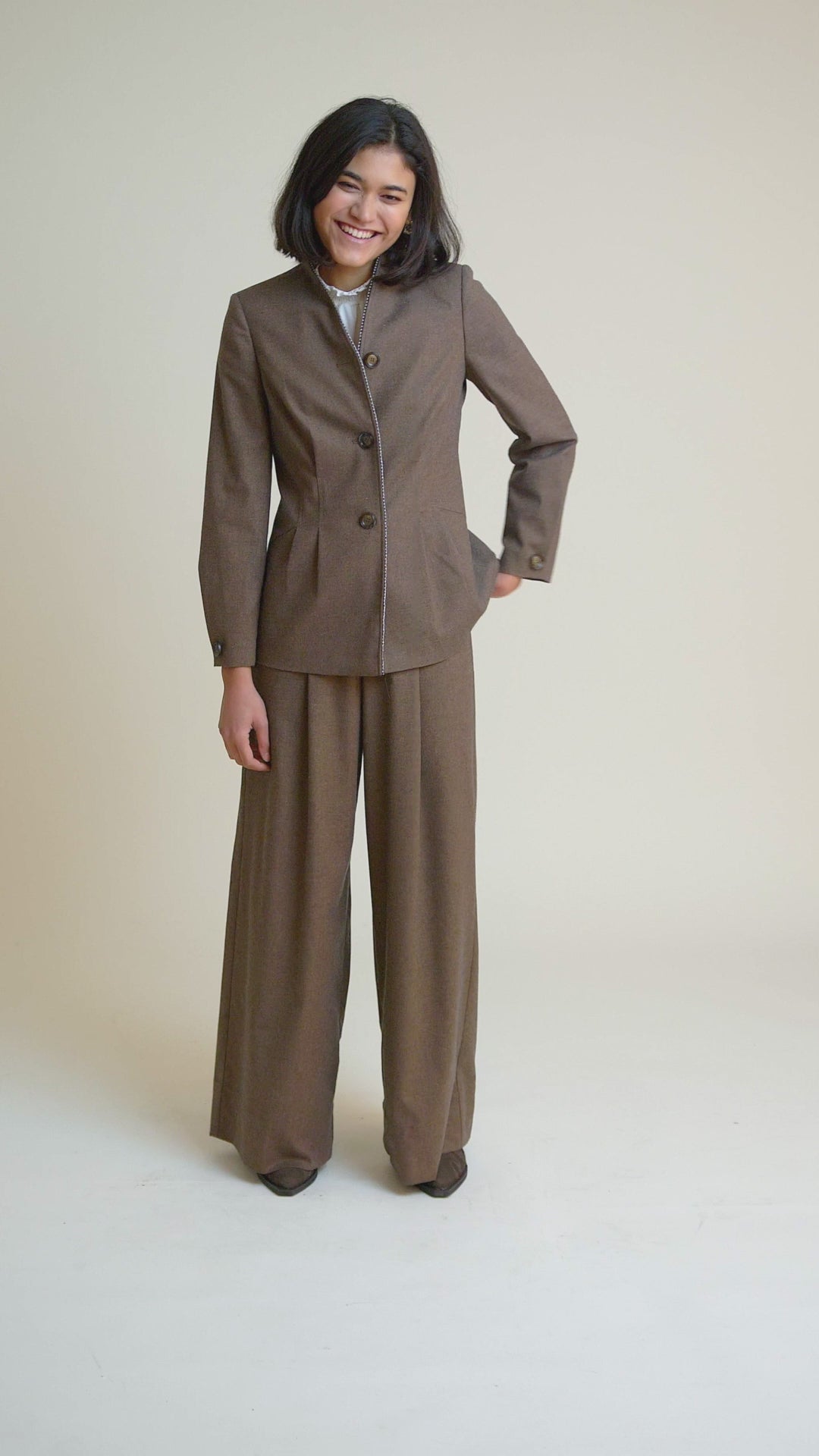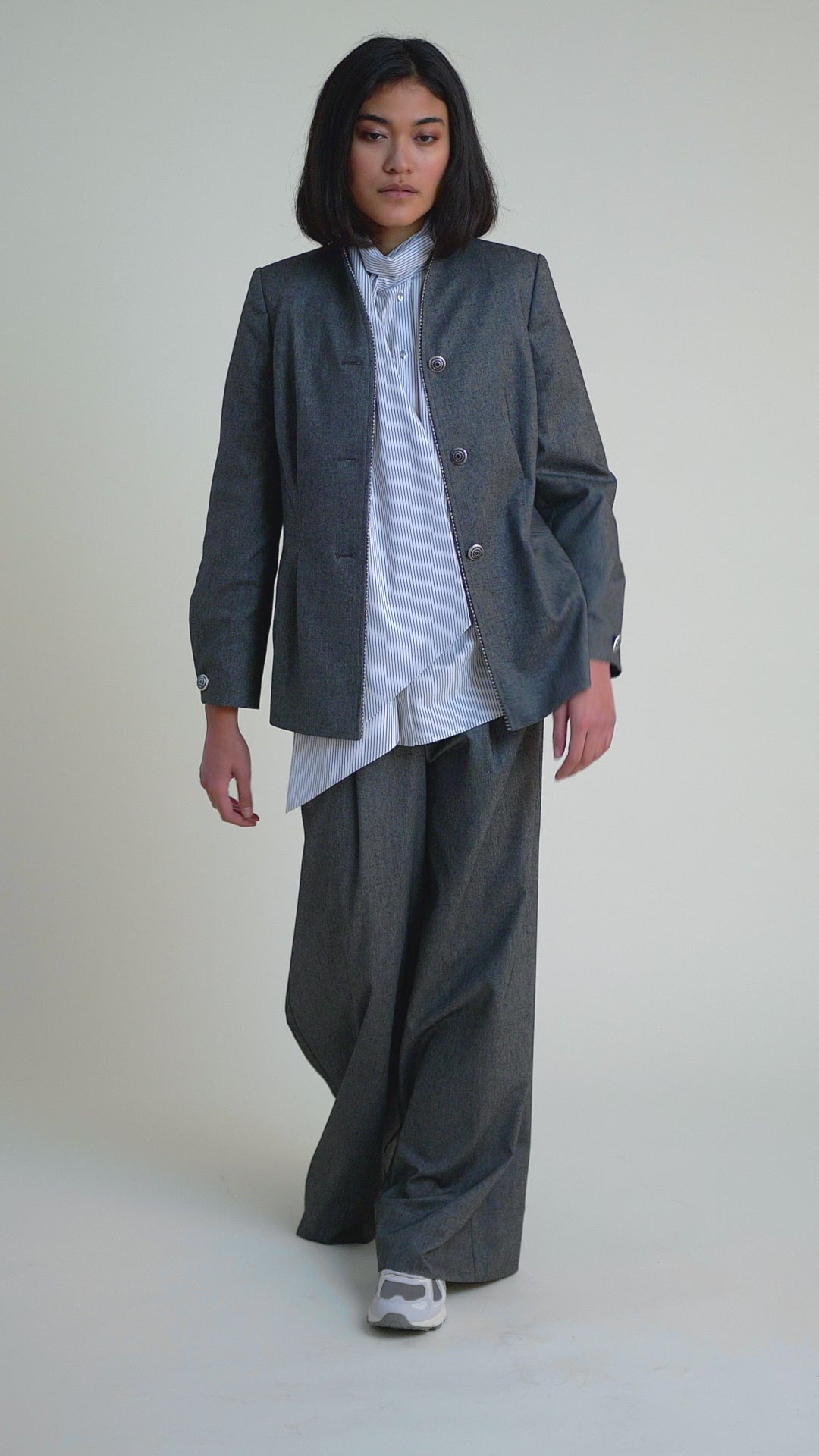 Die Abnäher in der Taille verleihen dem Flanell Blazer eine feminine Form ohne einzuengen. Schmuckknöpfe und Glitzerpaspel entlang der vorderen Kante werten den Blazer zusätzlich auf.