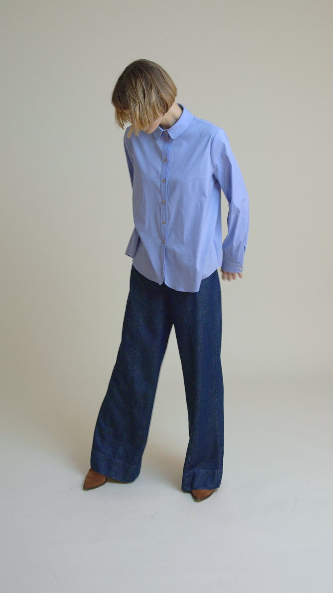 Hemdbluse mit besonderem Bubikragen und halber Knopfleiste mit Schmuckknopf aus weichem, elastischen Popeline.