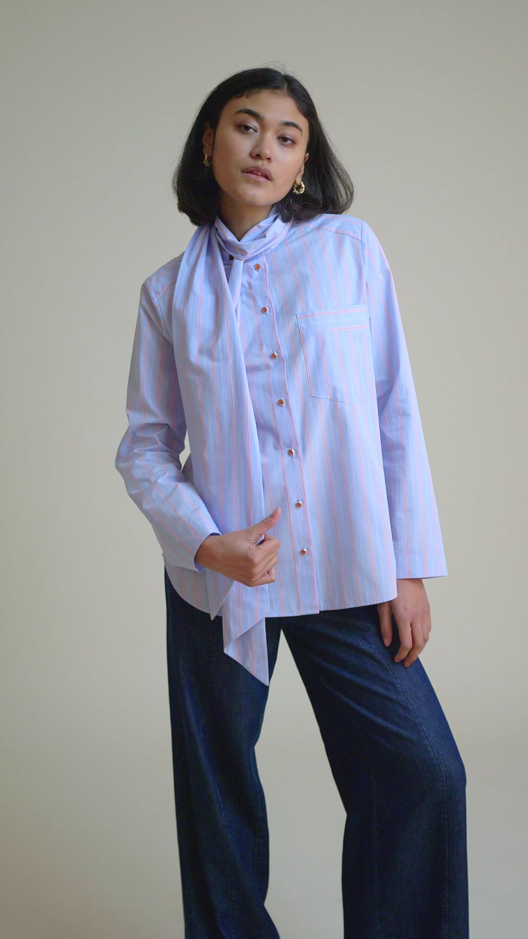 Hemdbluse mit Schalkragen für verschiedene Bindeoptionen aus fester Baumwolle mit Schmuckknöpfen.