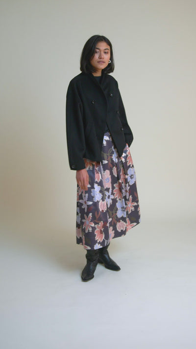 Kurze Wolljacke mit Kelchkragen, besonderen Faltendetail an den Ärmeln und breiten Leistentaschen.