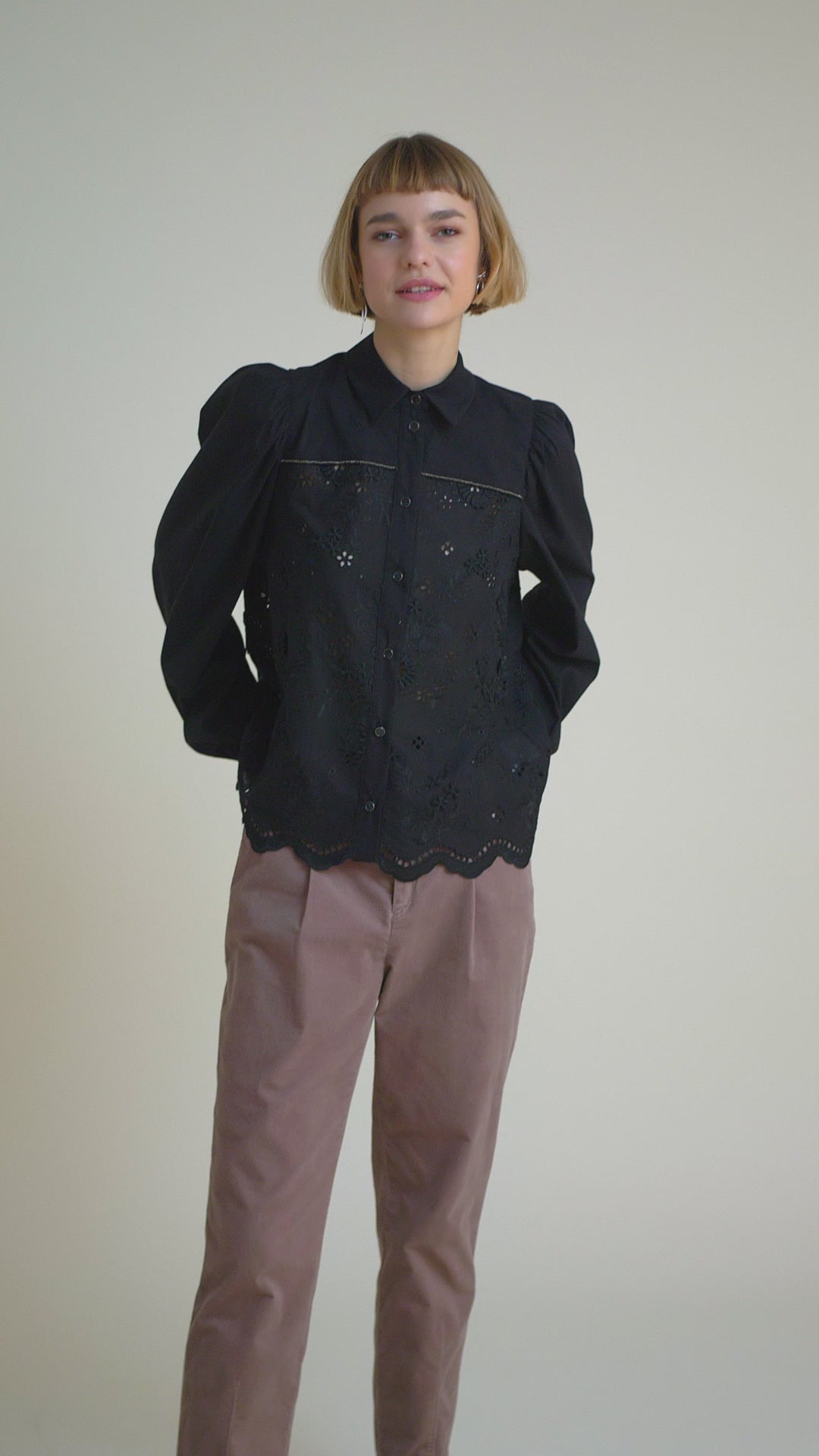 Kurze Spitzenbluse mit Puffärmeln und Glitzerborte zur Zierde im Materialmix.